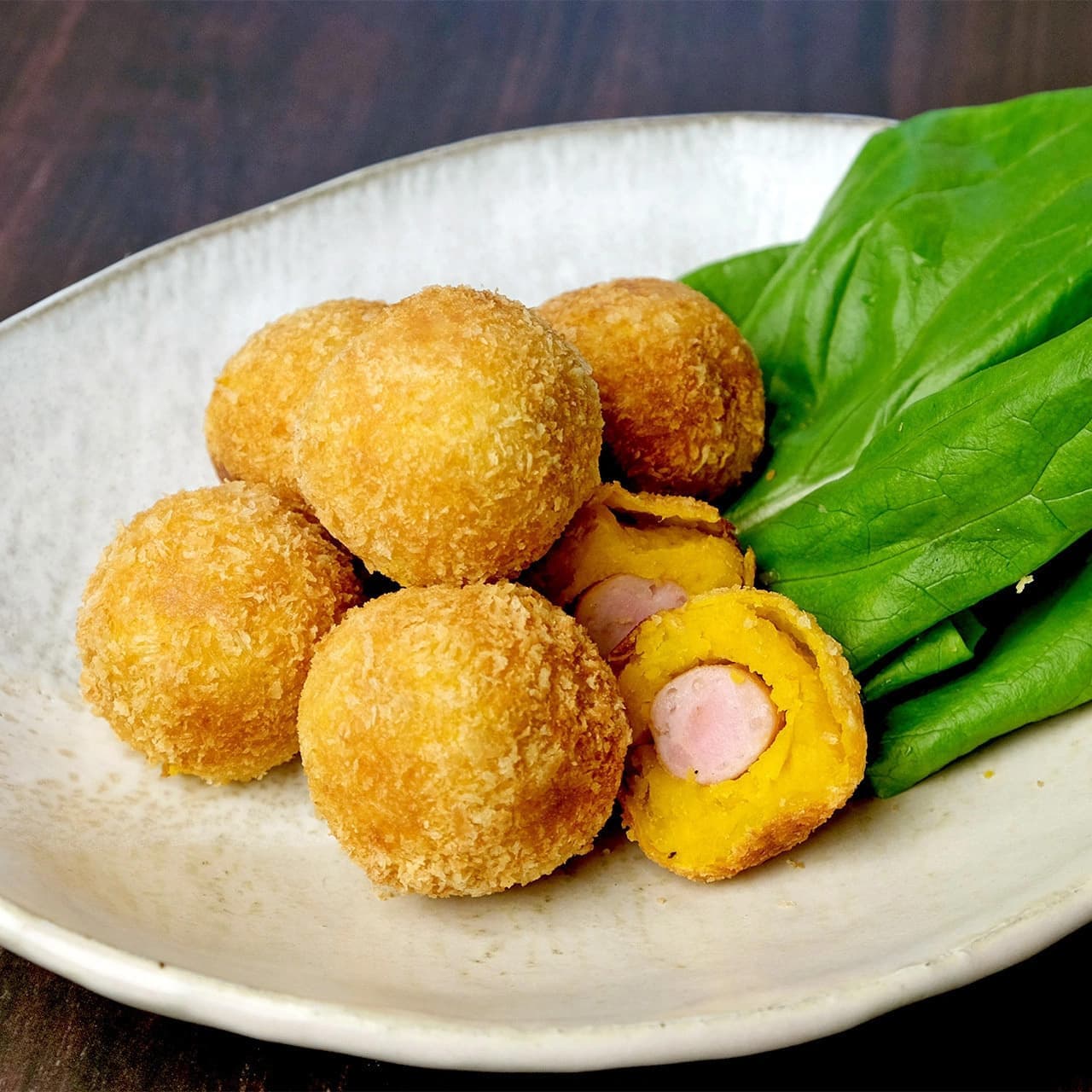 ②かぼちゃを6等分にし、中にソーセージを入れ丸いボール型にし、薄力粉、卵、パン粉の順につける。